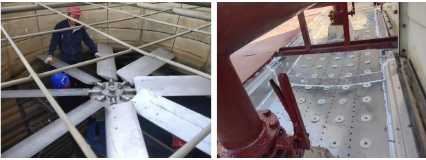 安裝新的冷卻塔超靜音風(fēng)機,拆掉出風(fēng)口消聲器 更換新的冷卻塔不銹鋼接水盤